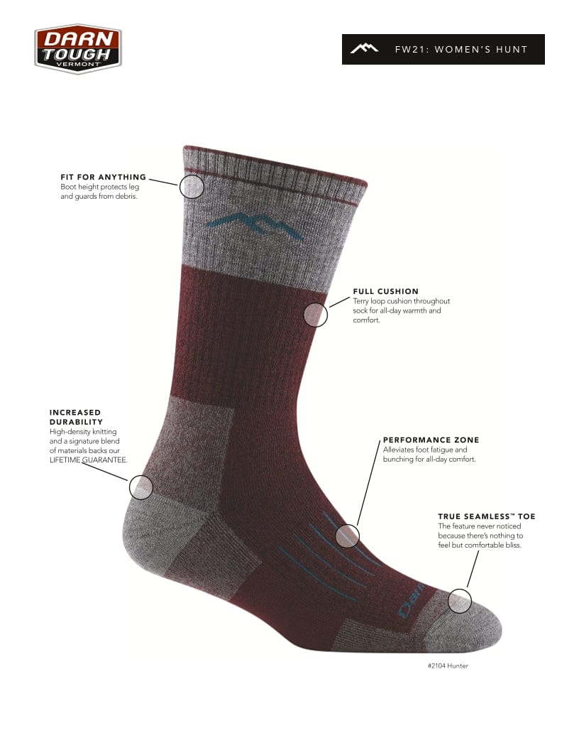 When you're trudging through soggy terrain, you don't want to worry about your feet. The Darn Tough Women's Heavyweight Hunting sock with full cushion is loaded with Merino wool for all-day, all-weather hunting comfort. Terry loop cushion runs the length of the sock for insulation and adds a moisture-wicking, breathable layer around the foot and leg. All Darn Tough socks are knit in Vermont and come with an unconditional guarantee.